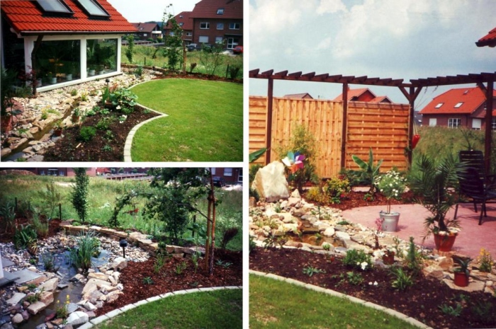 Die großzügige Terrasse wird umlaufen mit einem kleinen Bachlauf und einem angrenzendem Beet.