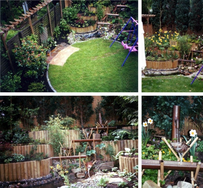 Über das in Stufen aufgebaute Beet, verläuft ein kleiner Bachlauf mit einem, aus Bambus- und Kupferrinnen gebauten, Wasserfall und endet in einem Teich am Fuß des Beetes.