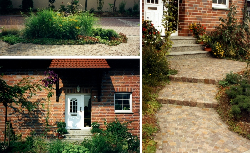 Treppenanlagen Trittstufen, Wege, Terrassen aus hellen Granit mit Basalt, Mauern aus Ruhrsandsteinen mit Bachlauf und Wasserfall.