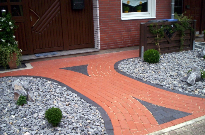 Umgeben von zwei mit Kalksteinschotter bedeckten Beetflächen, erstreckt sich der mit roten und anthrazitfarbenen Klinkerpflaster gepflasterte Eingangsbereich. Findlinge und eine lockere Bepflanzung mit Buchsbäumchen geben der Anlage einen mediterranen Touch.
